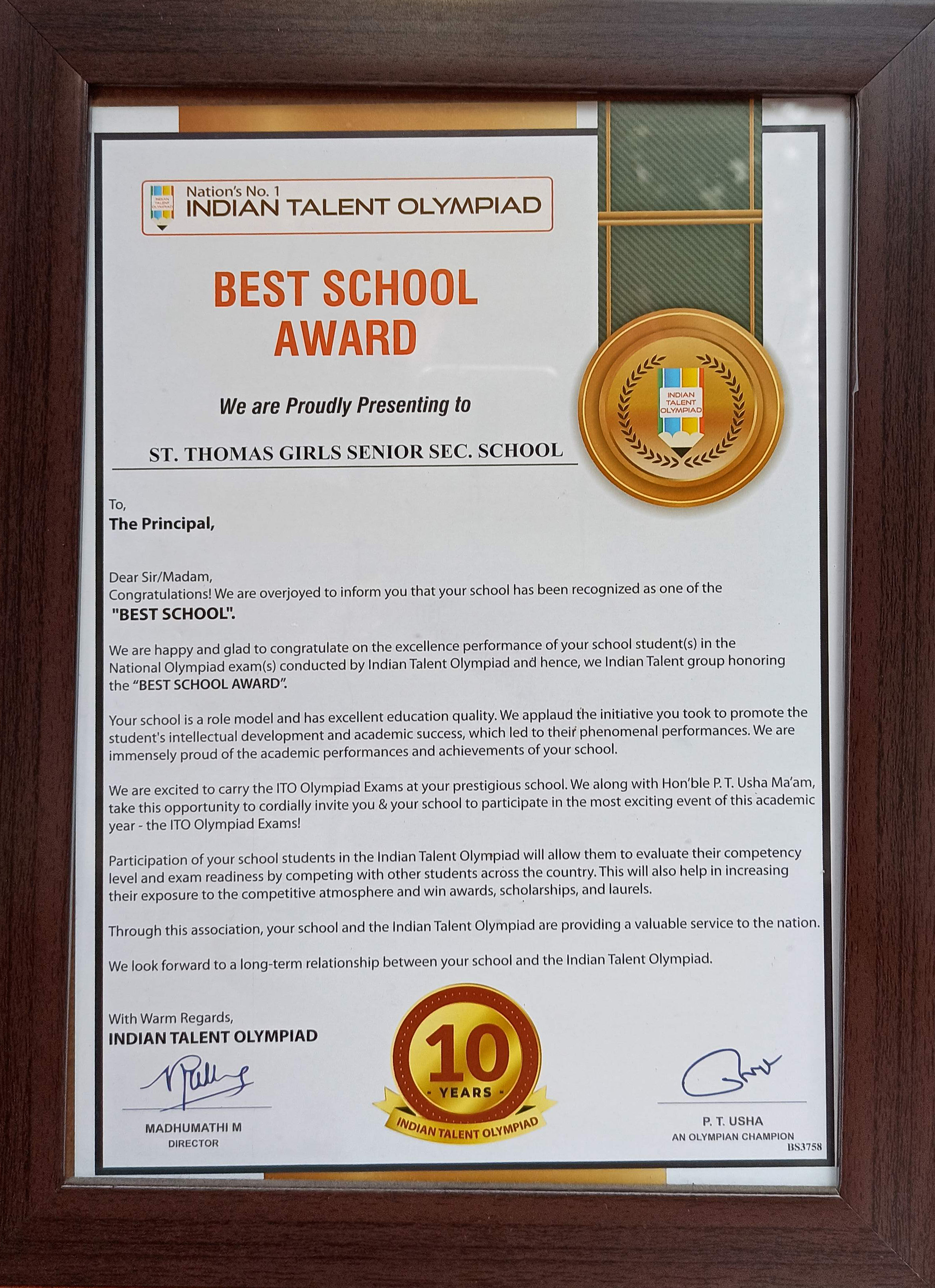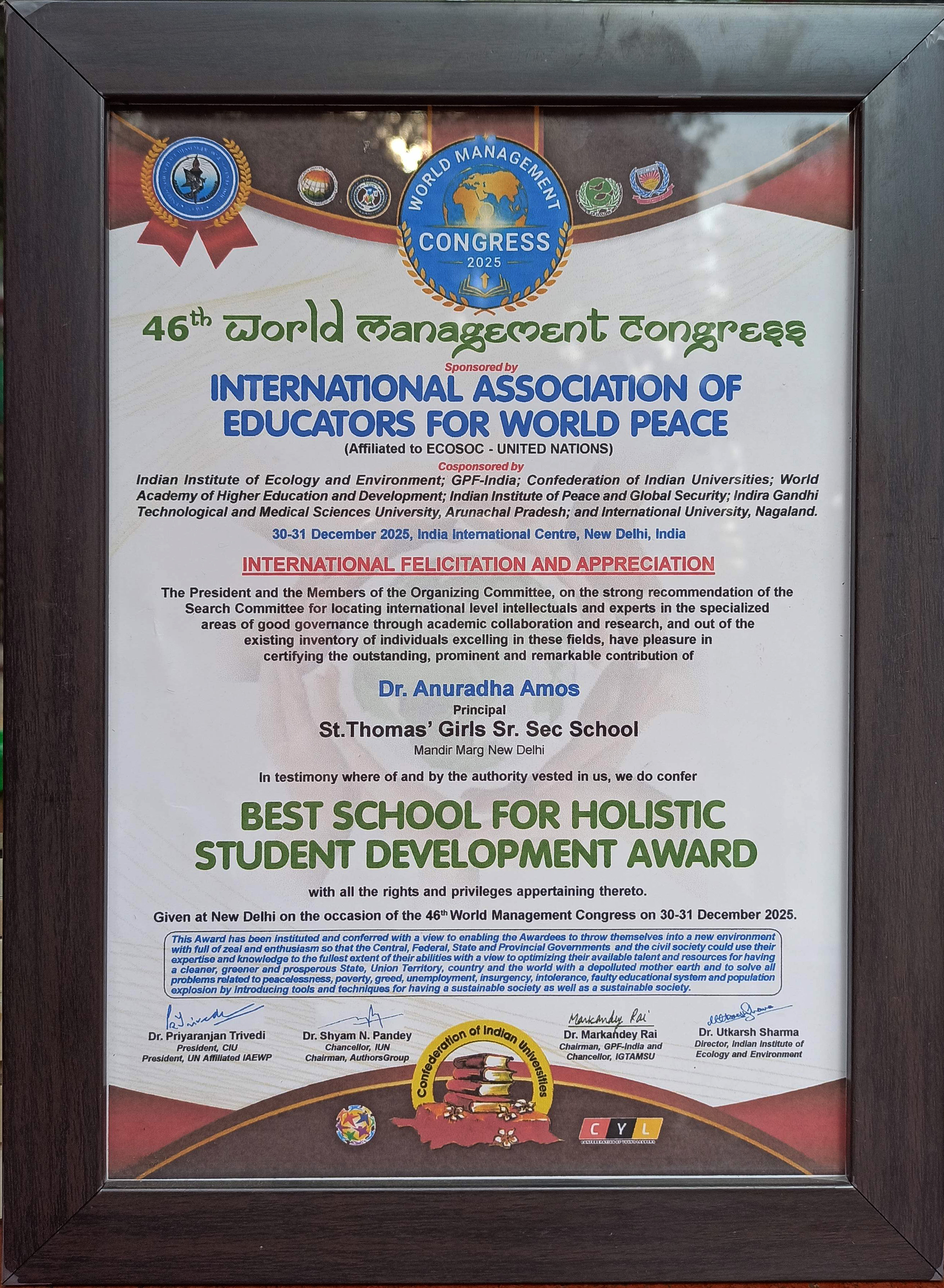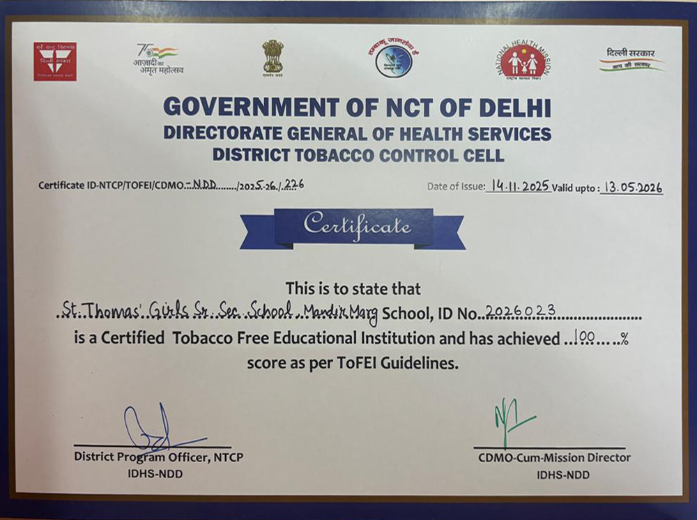 Award to St. Thomas' Girls Sr. Sec. School for being a Tobacco Free Institution