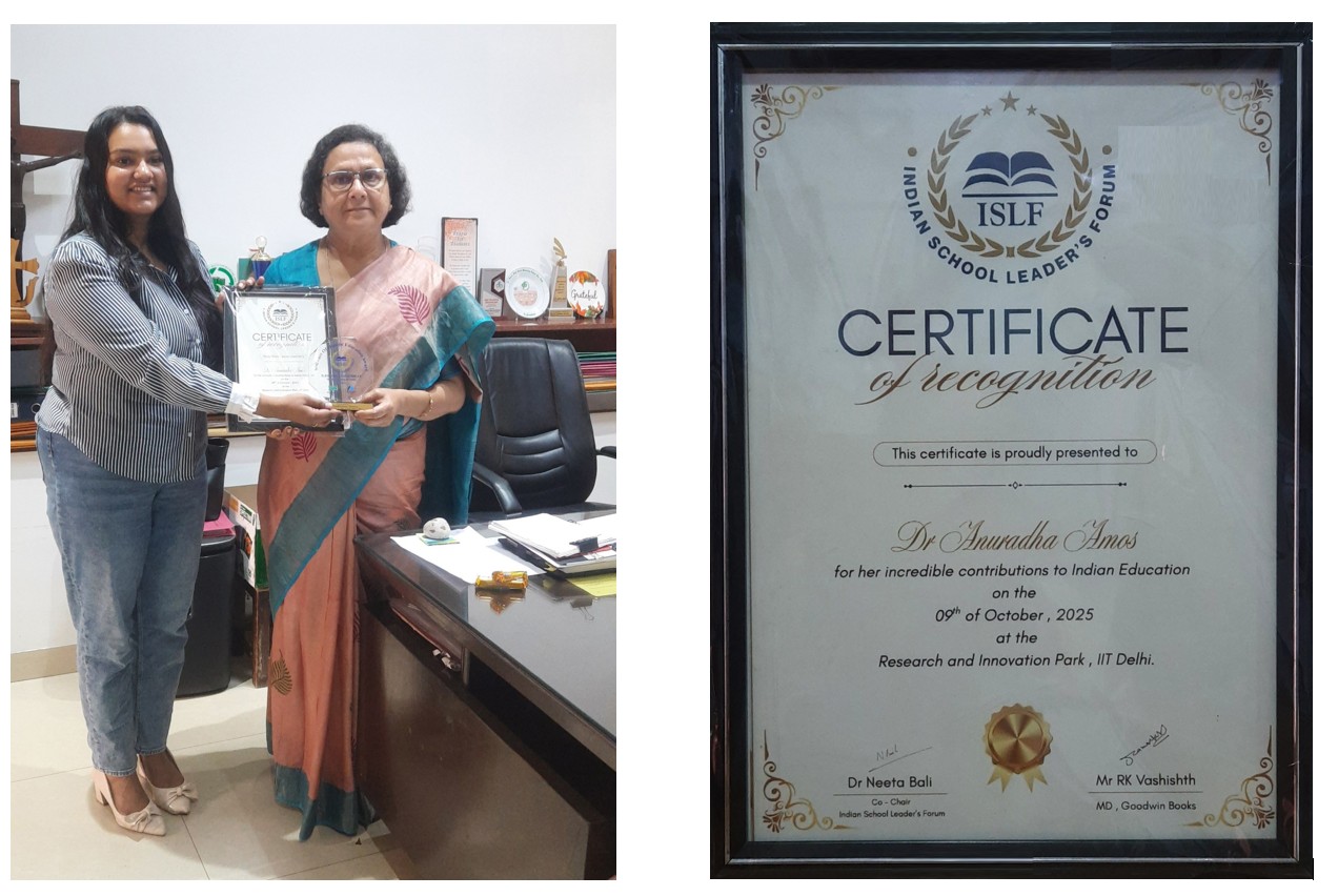 DR. ANURADHA AMOS RECEIVED AN AWARD FOR BEING A PRINCIPAL WHO HAS SUCCESSFULLY IMPLEMENTED INCLUSION IN THE SCHOOL
