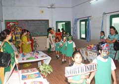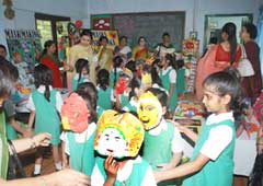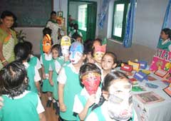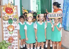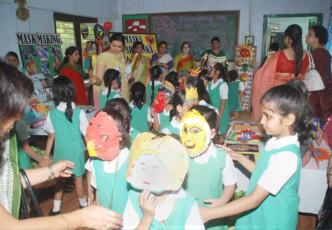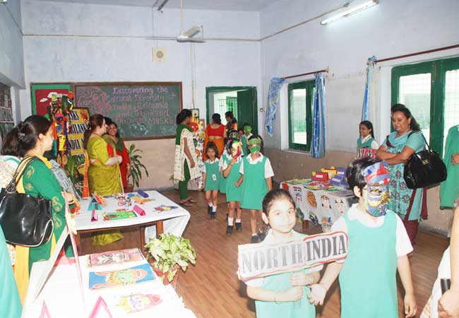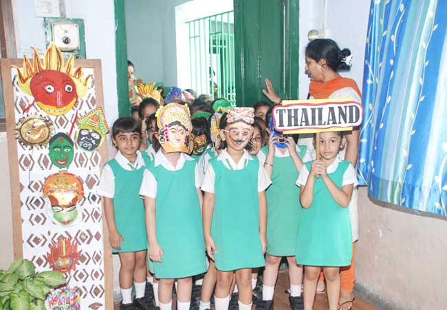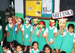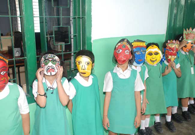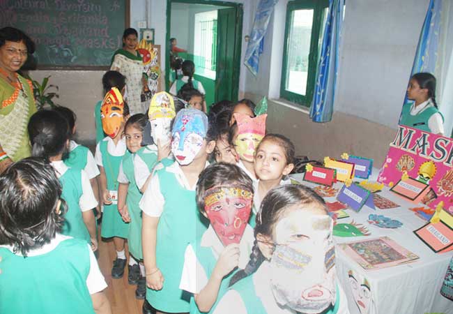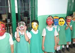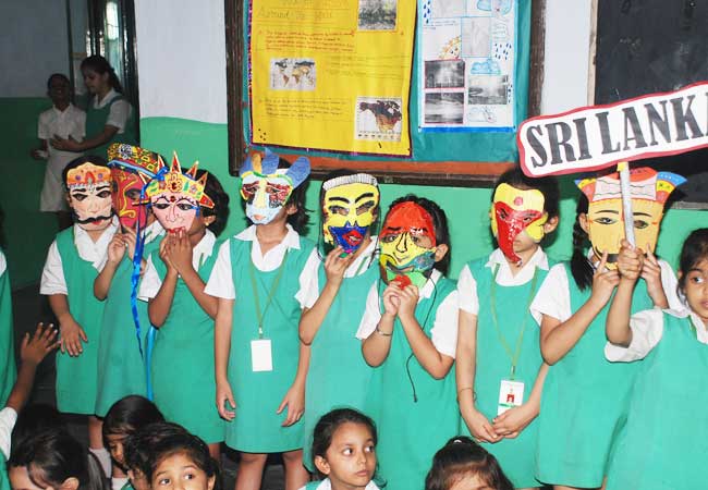 Brief Description : The Masks made by the students in first sub activity (workshop on mask making) were displayed through a parade in the school premises. Students were divided into 3 groups depicting the 3 countries. They wore the masks and the leader of the group displayed the name of the country through a placard and the whole school viewed it.