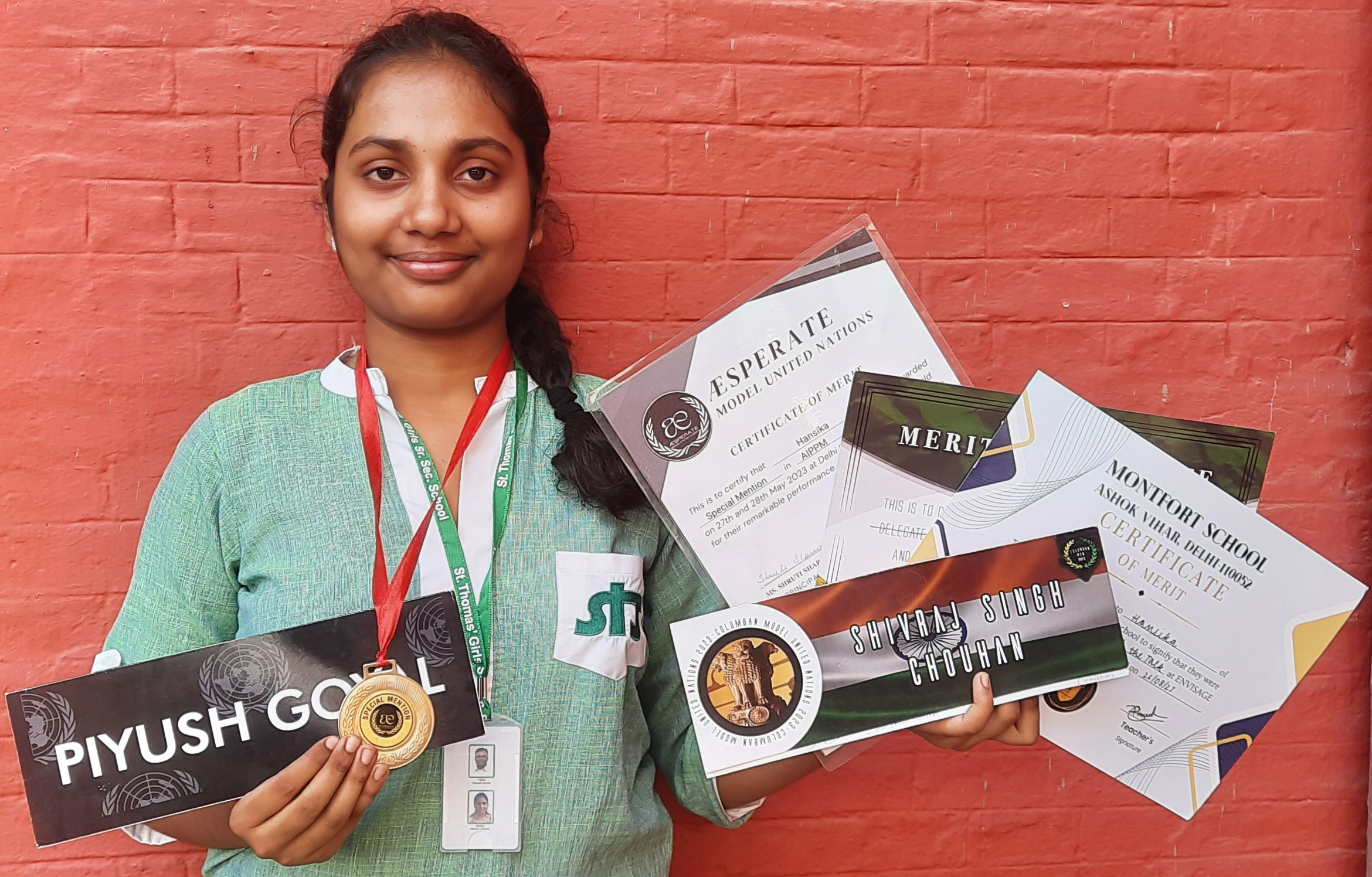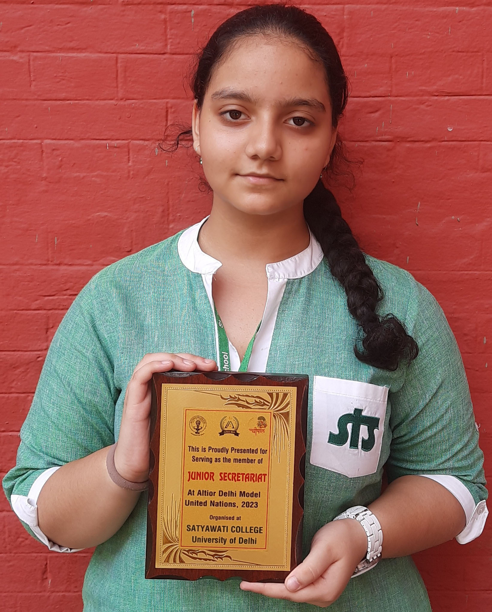 Amber Rana(IXD) received a trophy for serving as the member of the Junior Secretariat at Altior Delhi Model United Nations, 2023 organised at Satyawati College, University of Delhi.