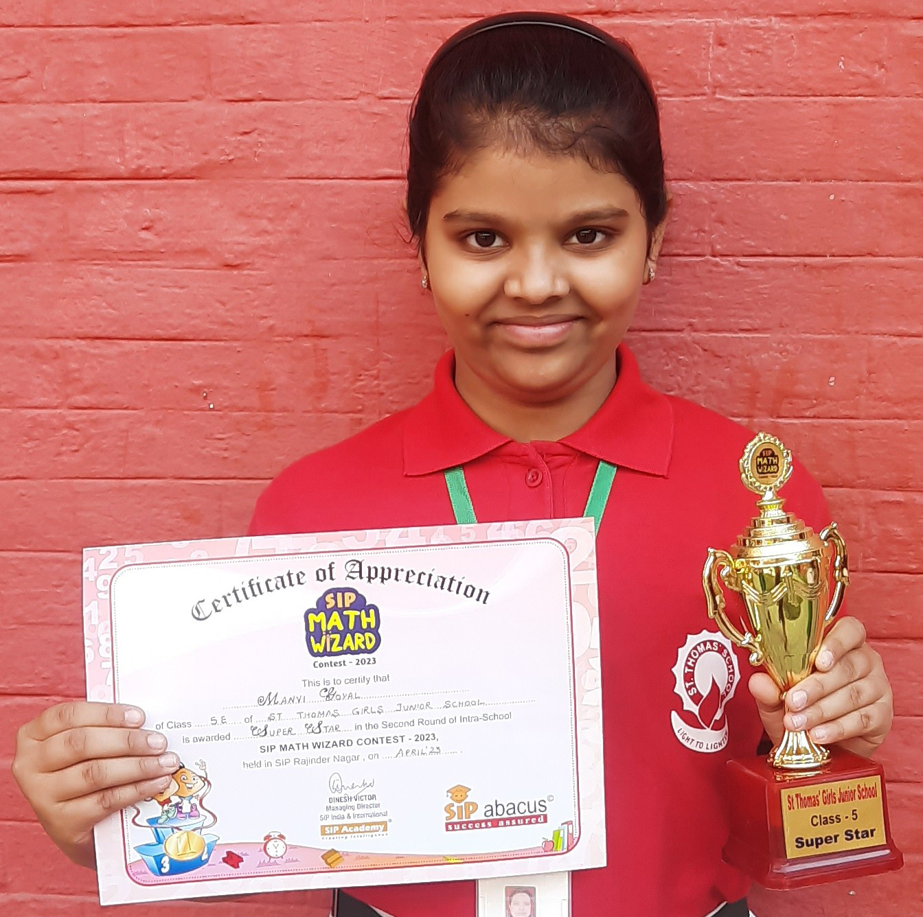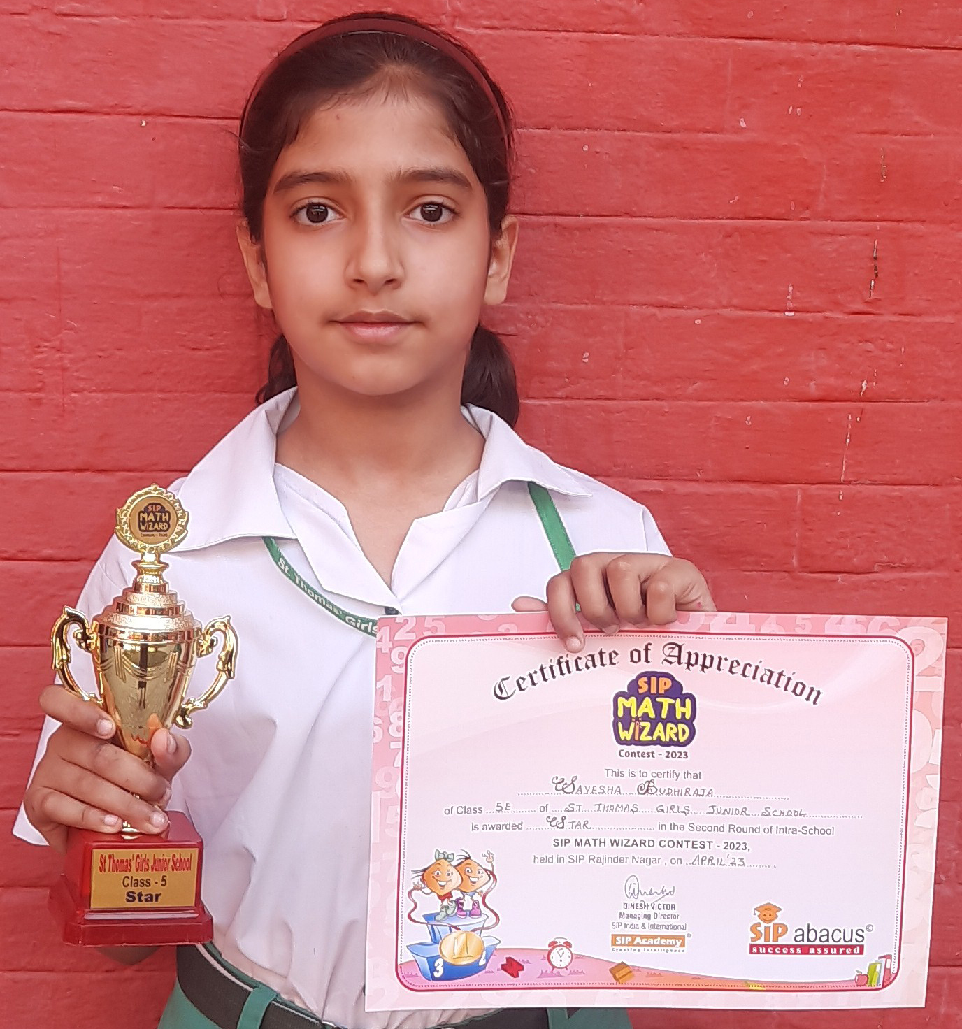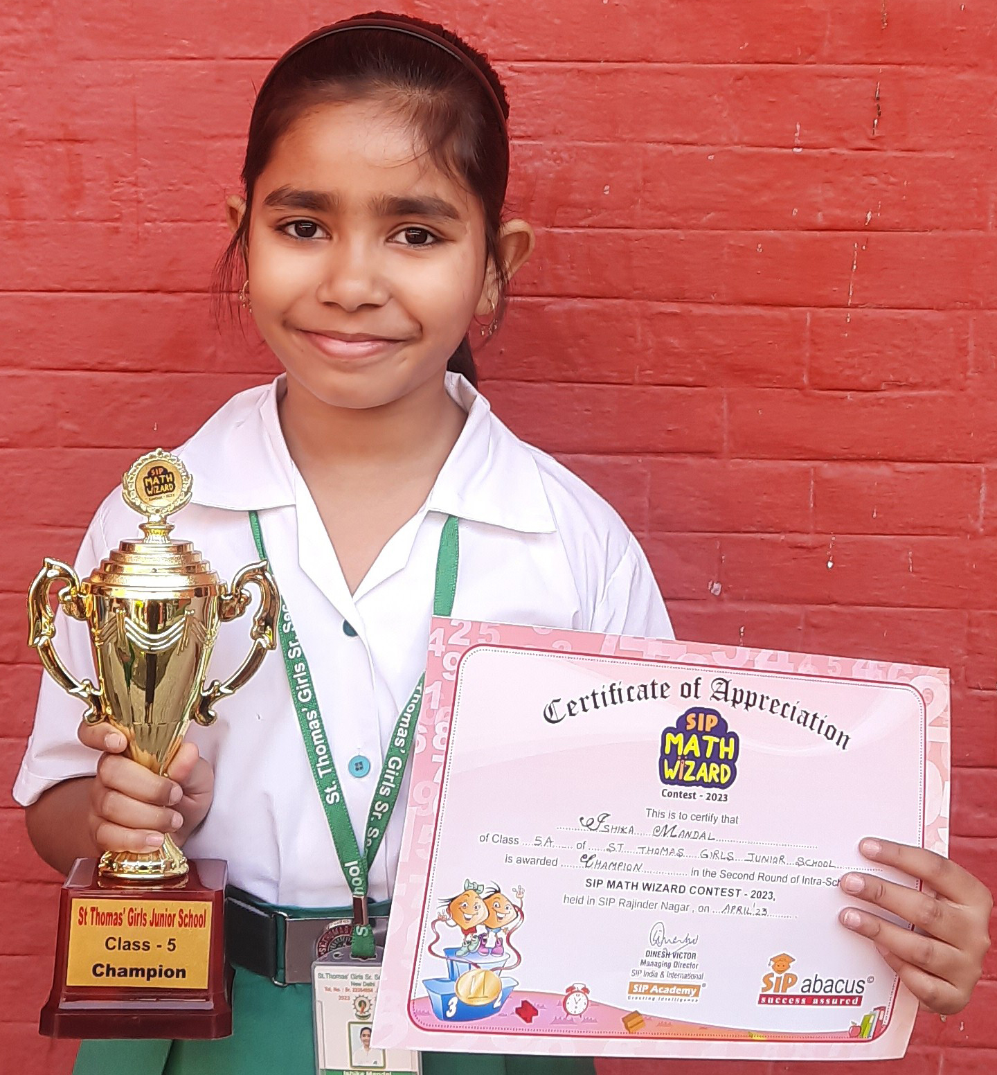 In the Second Round of Intra-School SIP MATH WIZARD CONTEST 2023, Ishika Mandal(VIA) won the I position, Maanvi Goyal(VIA) won the II position, Sayesha Budhiraja(VIE) won the III position.