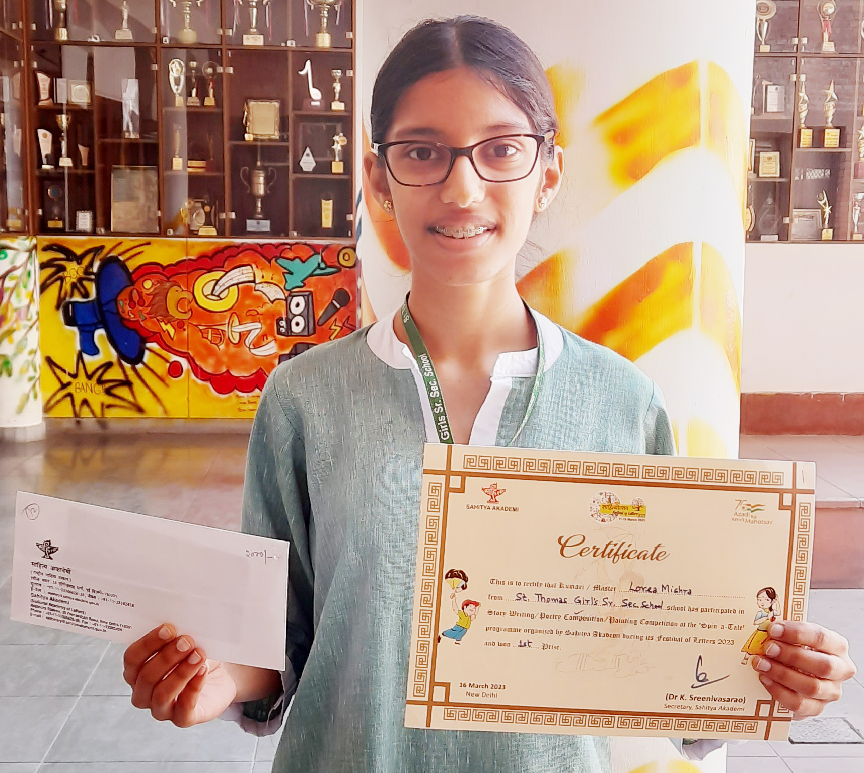 Sahitya Akademi conducted the Festival of Letters a very prestigious contest. Lorea Mishra(XA) won the I prize in the Poetry Writing Competition. The award