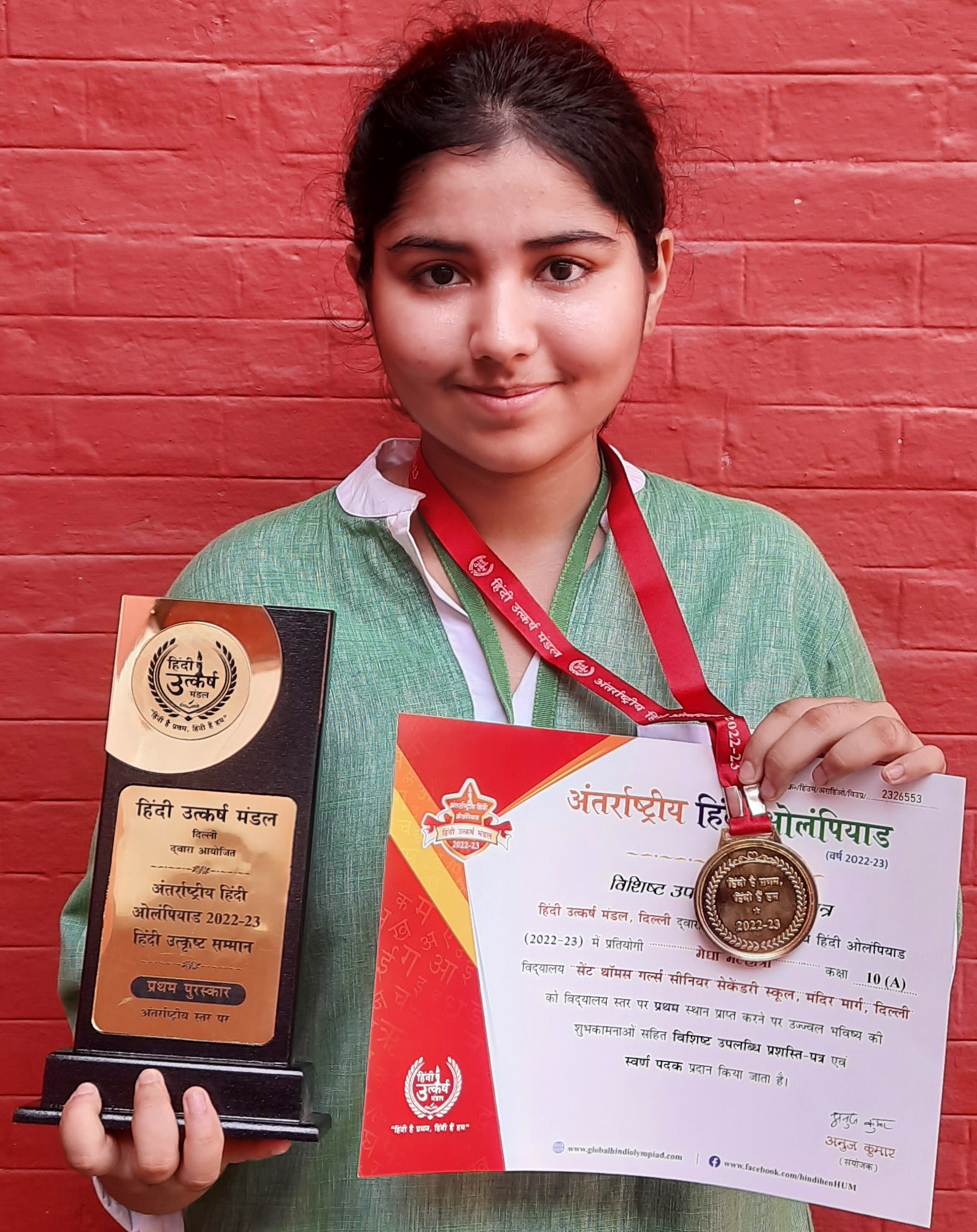 In the International Hindi Olympiad Megha Malhotra(XIHB) won a Gold Medal, a trophy, a merit certificate and a cash prize of Rs. 6100.