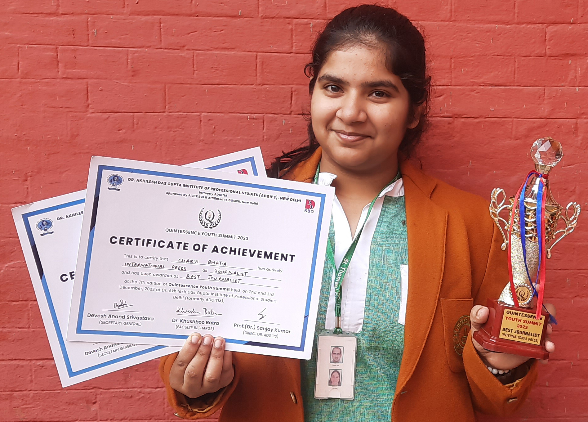 Charvi Bhatia(XIHA) was adjudged as Best Journalist(International Press) in the