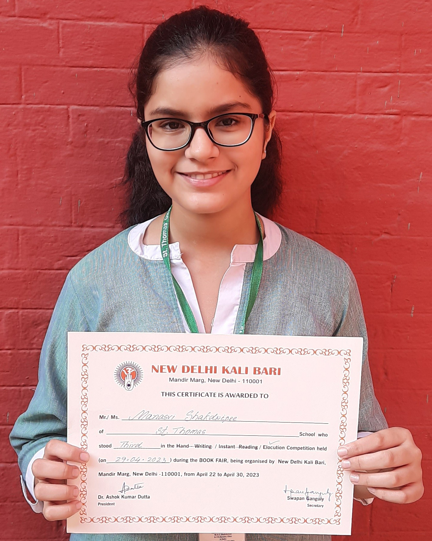 Manasvi Shakdwipee(XA) won III prize in Elocution Competition (Hindi Speech) organized by New Delhi Kali Bari.