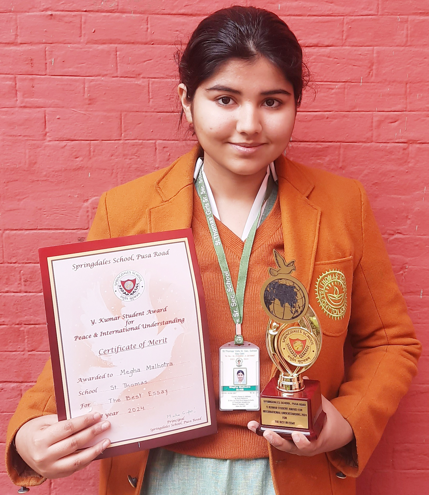 Megha Malhotra(XIHB) won The Best Essay award in the prestigious Y. Kumar Student Award for Peace & International Understanding held at Springdales School, Pusa Road.