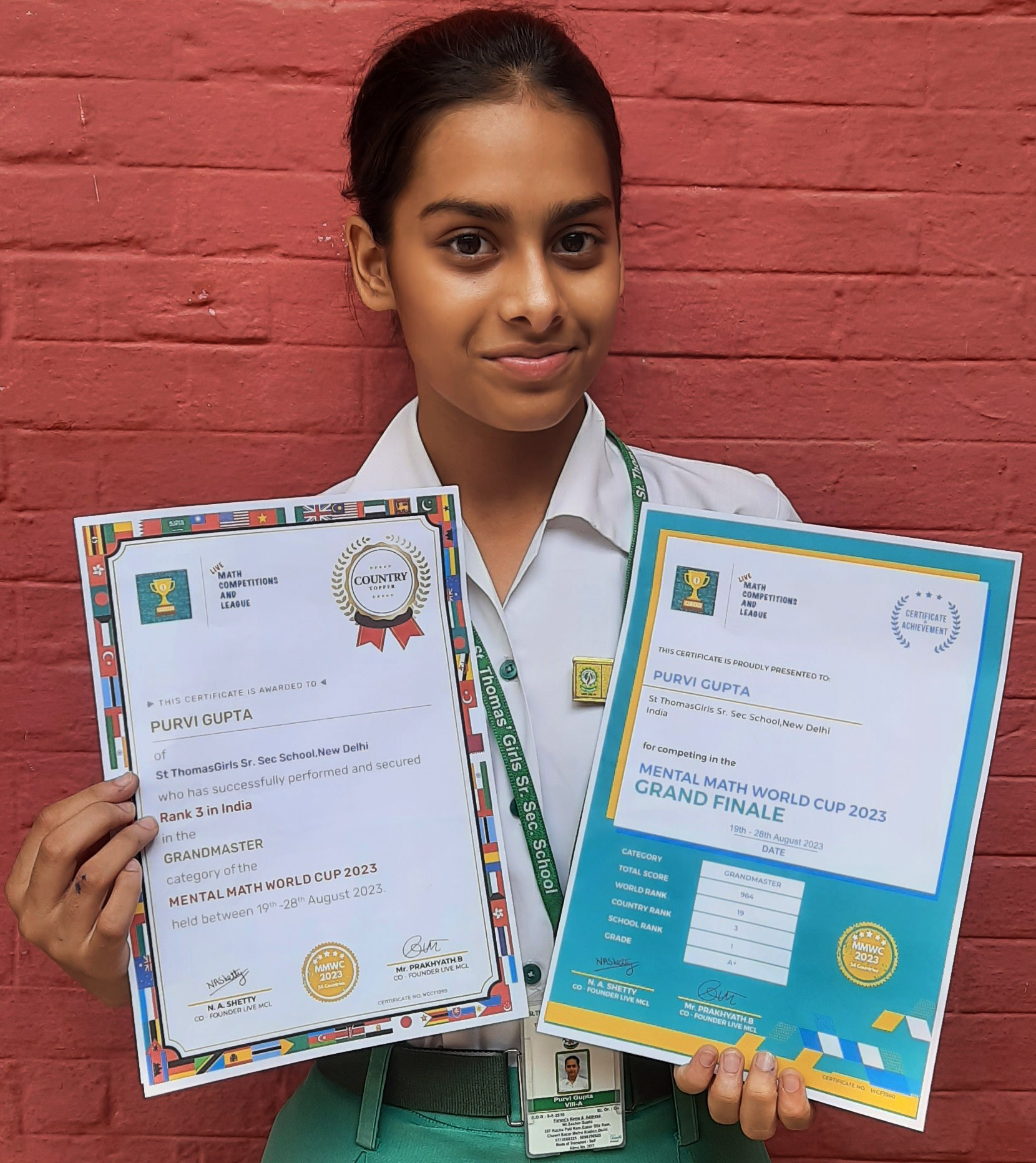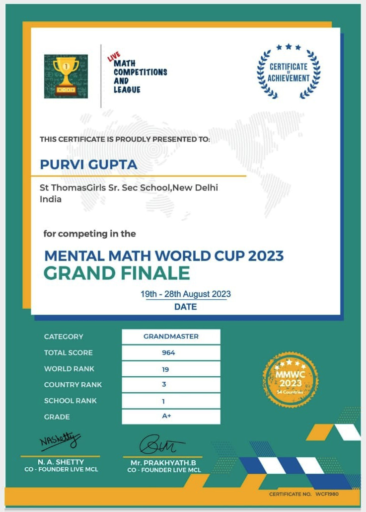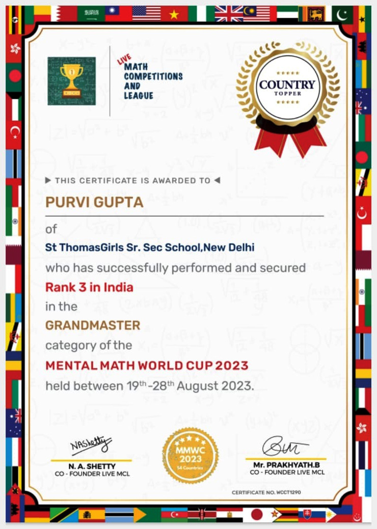 In the Mental Mathematics World Cup, Purvi Gupta (VIIIA) has secured the 19th rank in the World and the 3rd rank in India.