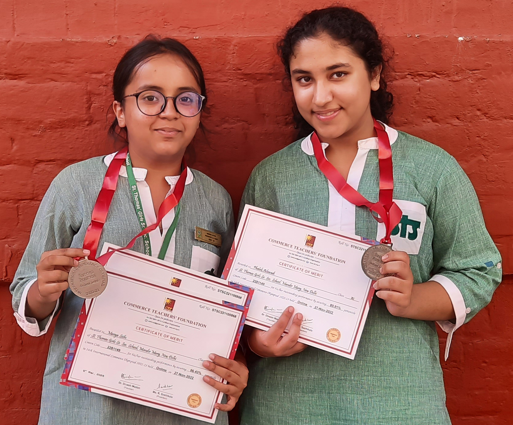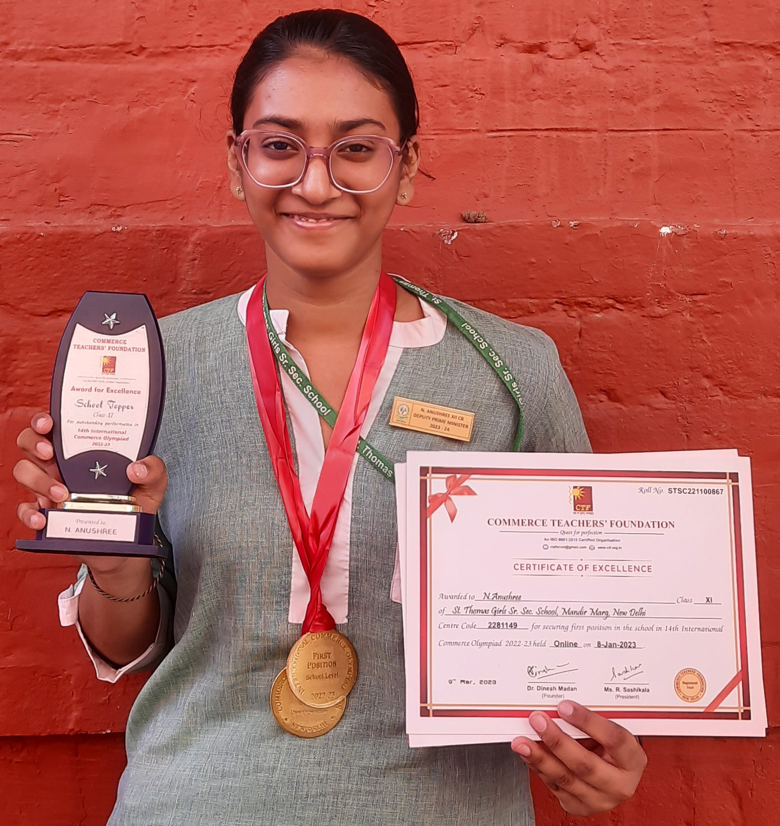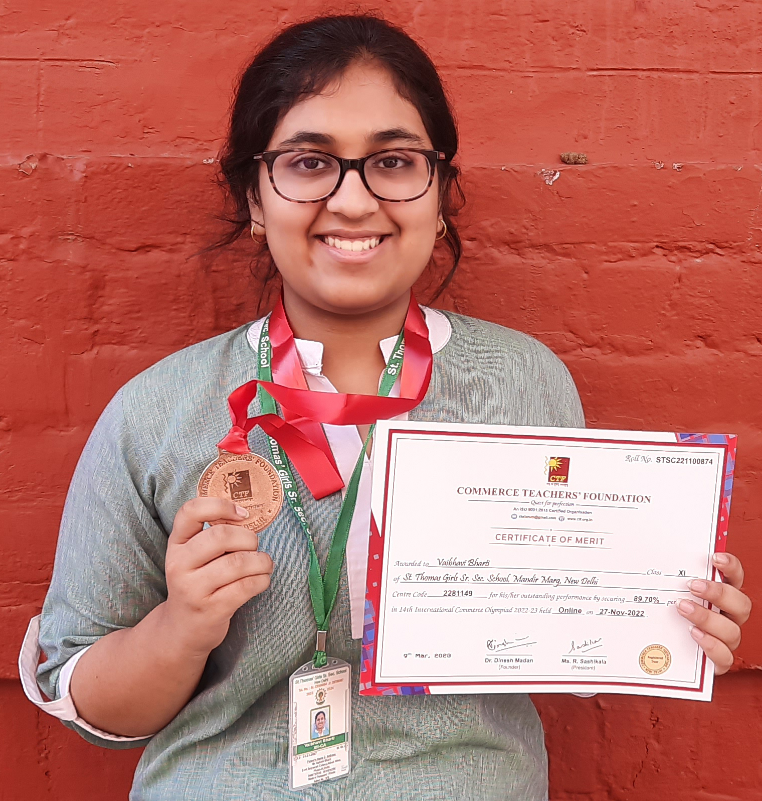 In the International Commerce Olympiad organized by the Commerce Teacher's Foundation, the following students won - N. Anushree(XIICB) - Toppers Trophy, 2 Gold Medals along with certificate of excellence and merit. Phalak Ailawadi(XIICA) & Manya Sethi (XIICA) - II position, Silver Medals. Vaibhavi Bharti(XIICA) - III position, Bronze Medal.