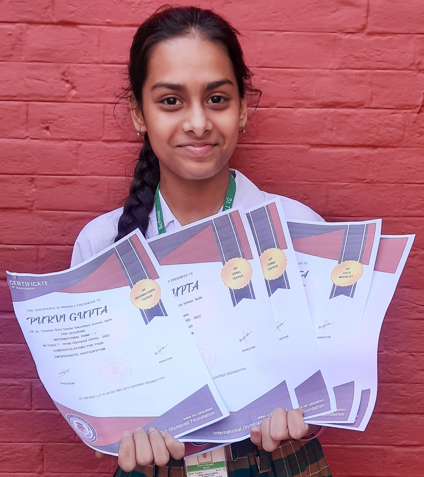 Purvi Gupta(VIIA) has done remarkably well in the International Olympiad Foundation. She won a Trophy, Medal and Certificate in Hindi with International Rank 1, in Science with Zonal Rank 1, in Spell Talent a Zonal rank.